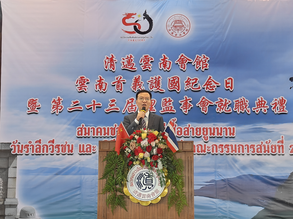 陈总领事表示,今年是台湾光复80周年,也是云南首义护国运动110周年。110年前,云南人民以护国首义的壮举喊出了追求进步、反对日本军国主义侵略的正义之声。希望各位云南侨胞继续发扬爱国爱乡优良传统,坚定恪守一个中国原则,坚定支持祖籍国统一大业,坚决反对“台独”分裂和外部干涉,警惕日本军国主义阴魂不散,为深化中泰传统友好、推进民族复兴伟业贡献更多力量。